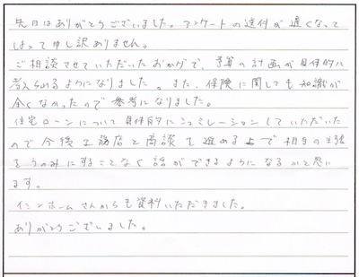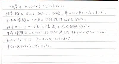 住宅ローンや各種保険の商品知識の豊富さや私の家庭の実情に即した具体的なプランの提案はさすがプロだなと思いました。