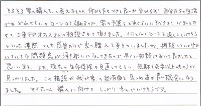 この相談が我が家の経済面を見つめ直す良い機会になりました。マイホーム購入に向けてしっかり歩んでいけそうです