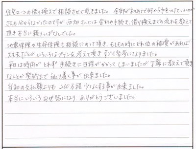 住宅ローンの借り換えで相談させて頂きました。全部が初めてで何から手をつけていいのかさえも分からなかったのですが、西畑さんには金利や手続き、借り換えまでの流れを教えて頂き本当に頼りっぱなしでした。