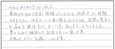 繰上返済をしたらどうなるのかなど、かなり細かに出していただき、すごく安心して話を聞くことができ納得できました。